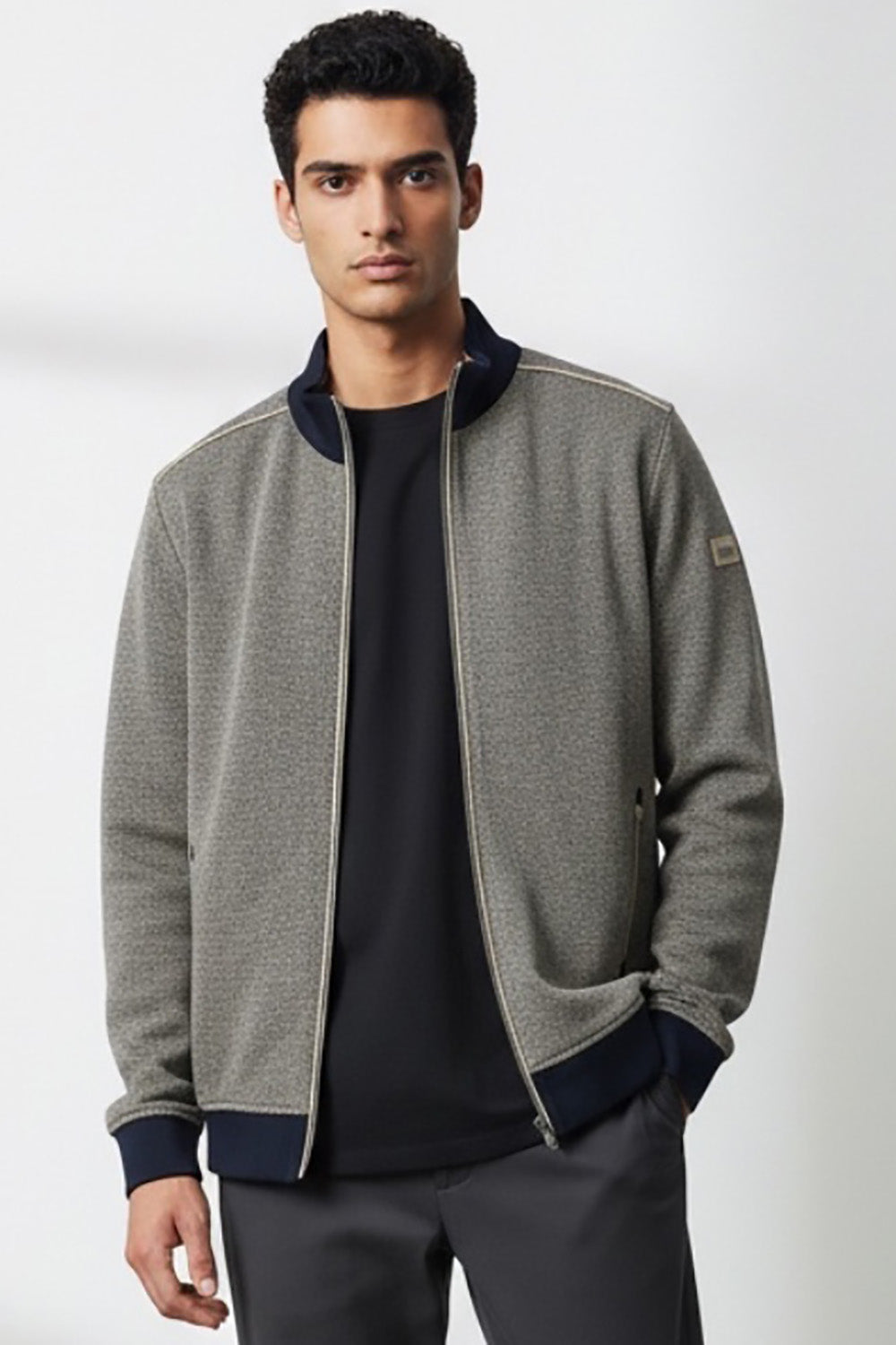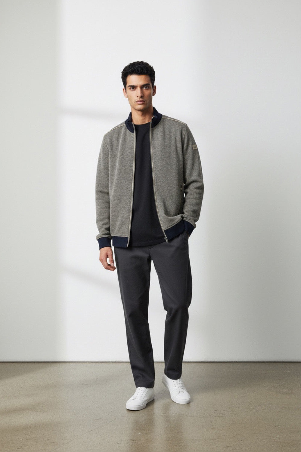 This Bugatti men's knit jacket in a modern fit combines an elegant jacquard pattern with exceptional comfort. The cotton-polyester blend ensures a comfortable fit. It features colorful accents and is equipped with a stand-up collar, zipper, and practical zip pockets, making it ideal for leisure and everyday wear.