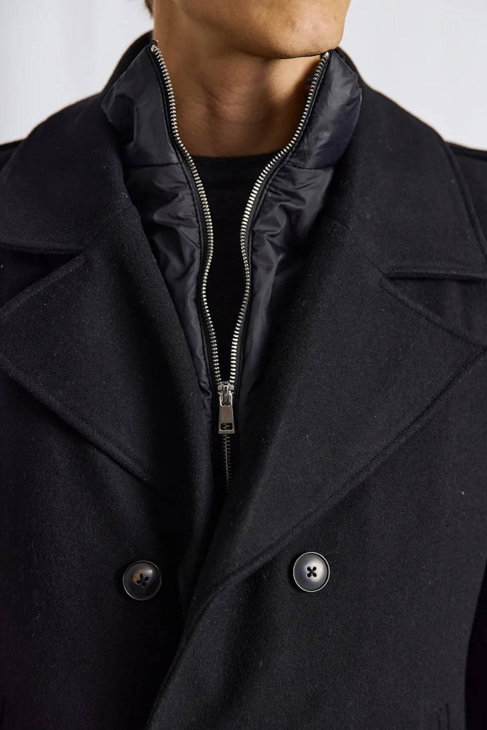 The Nelson Coat in Black is built from a premium wool and polyester blend, this double-breasted coat delivers reliable warmth through even the harshest winters. What sets it apart is the ingenious detachable nylon vest with zipper—giving you the flexibility to adjust your layering as temperatures shift. Bold wide lapels, distinctive horn buttons, and shoulder button accents showcase meticulous attention to detail, while the structured belt creates a flattering, intentional silhouette. Thoughtfully positioned front waist pockets and an interior chest pocket prove that elegance never compromises on practicality.