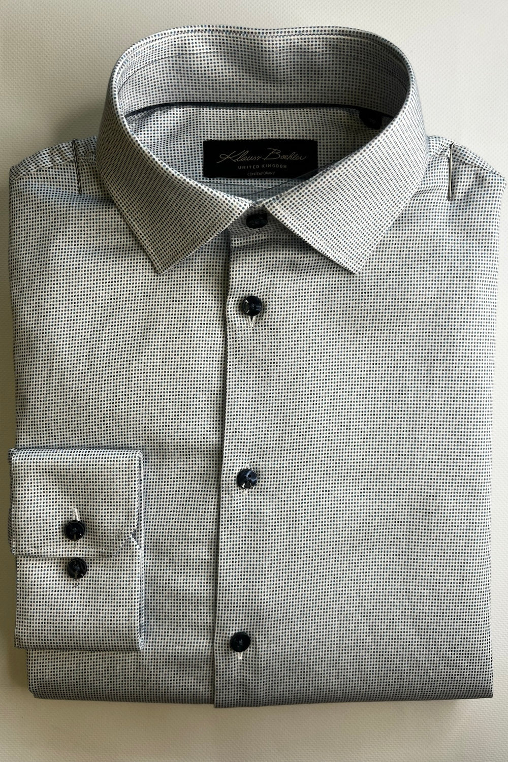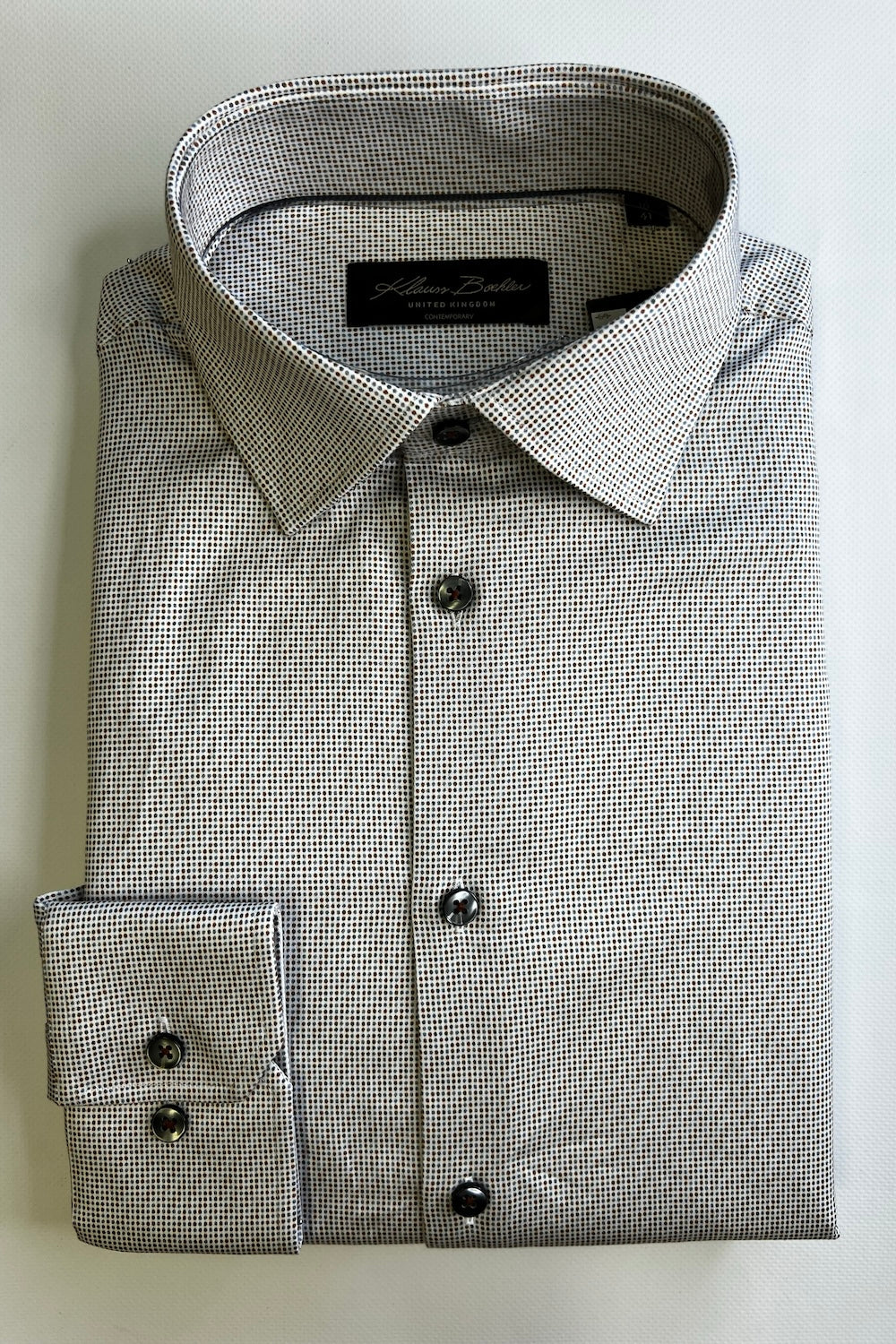 • 97% Cotton, 3% Spandex • Dot pattern • Classic collar • French placket • Care according to label instructions