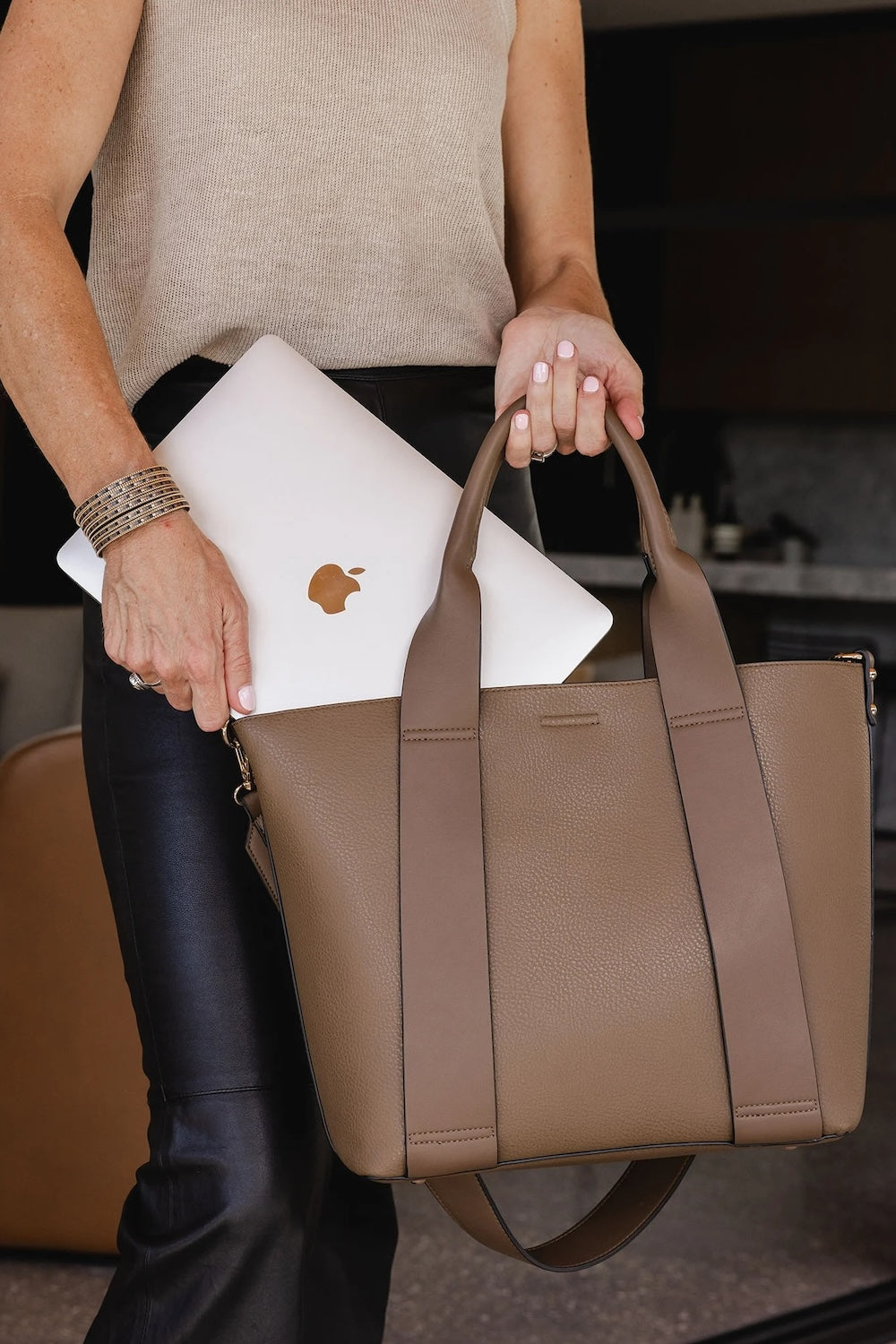 • 100% Vegan Leather • Internal Features: 1 Zip Pocket, 2 Slip Pockets, Secure Zip Centre Compartment • Fits up to a 16" laptop • W16 x H12 x D5.5”