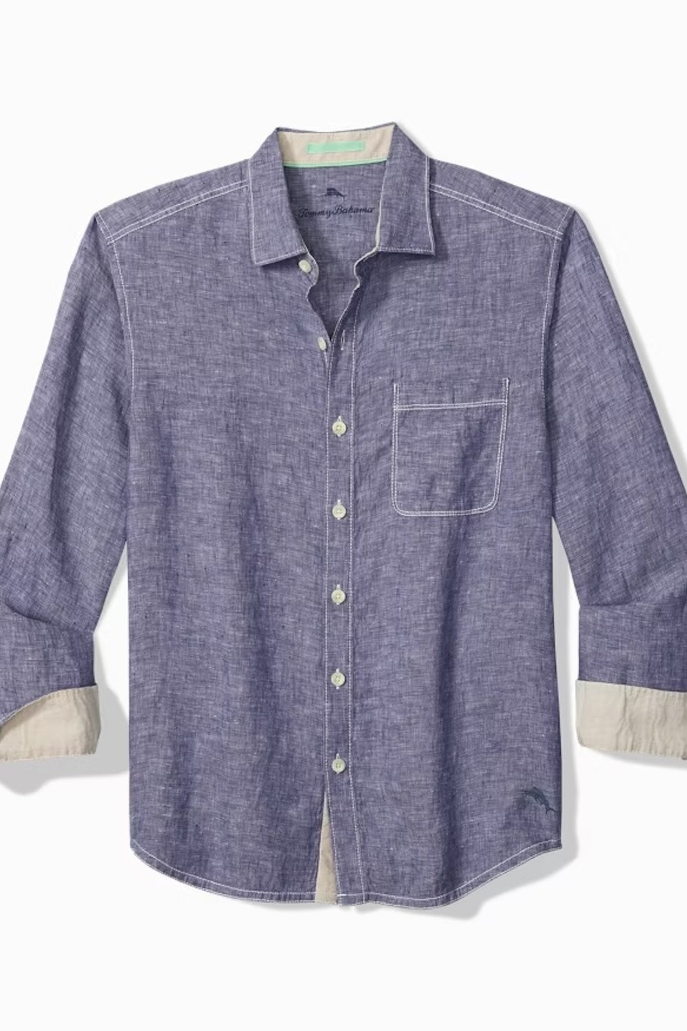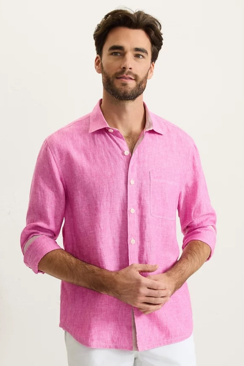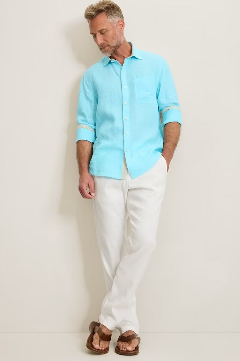 • 100% Linen • Two-piece stand collar • Rounded patch chest pocket • Shirttail hem • Embroidered Marlin logo at the hem • Care according to label instructions