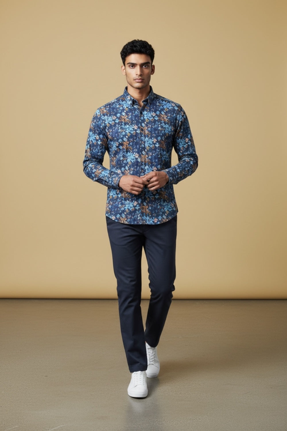 This navy long-sleeve casual shirt designed for the discerning gentleman. The subtle flower pattern brings understated sophistication to your collection, while the authentic French placket ensures impeccable tailoring and refined detail. Whether you're dressing up for dinner or keeping it relaxed on the weekend, this versatile shirt adapts effortlessly to any occasion.
