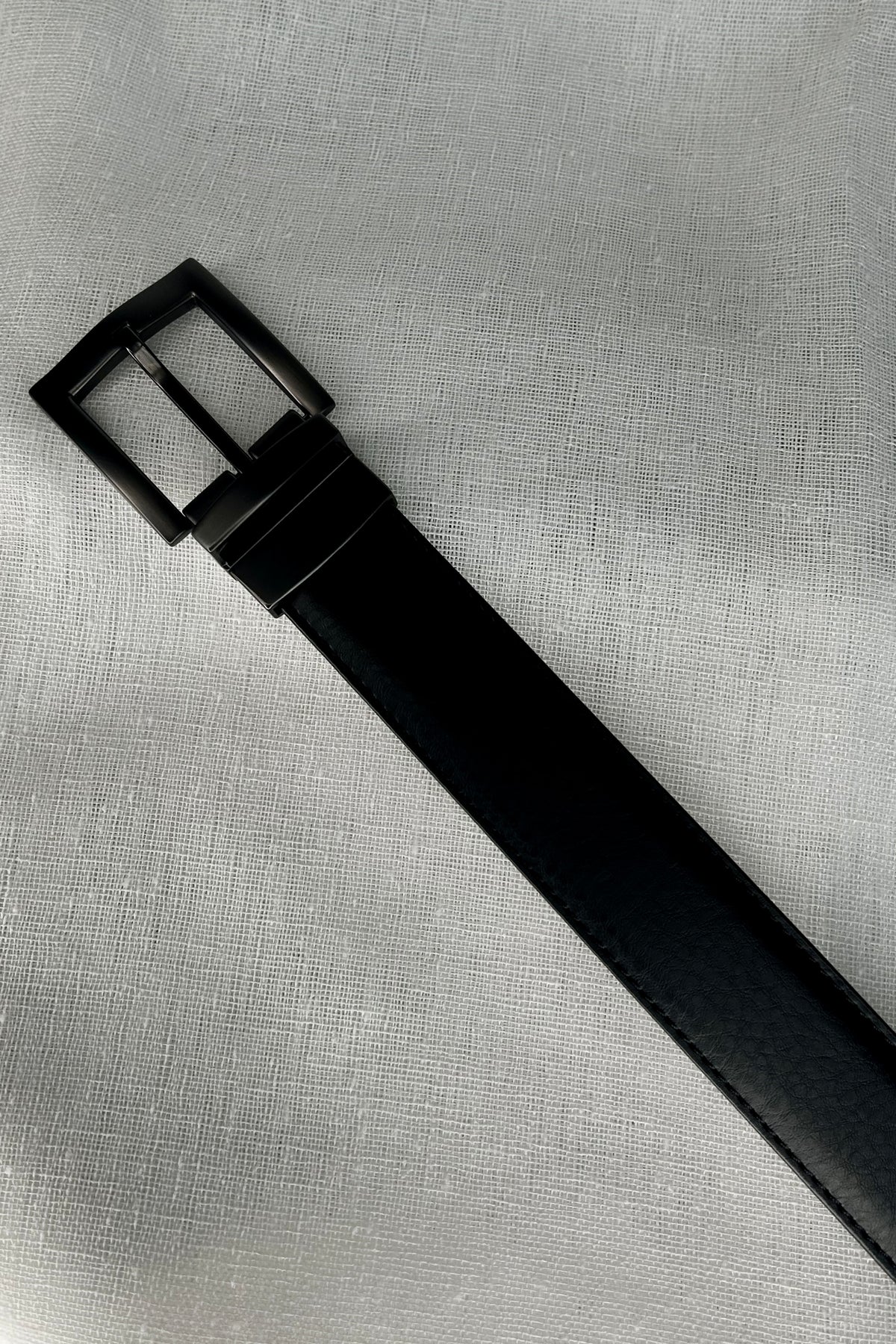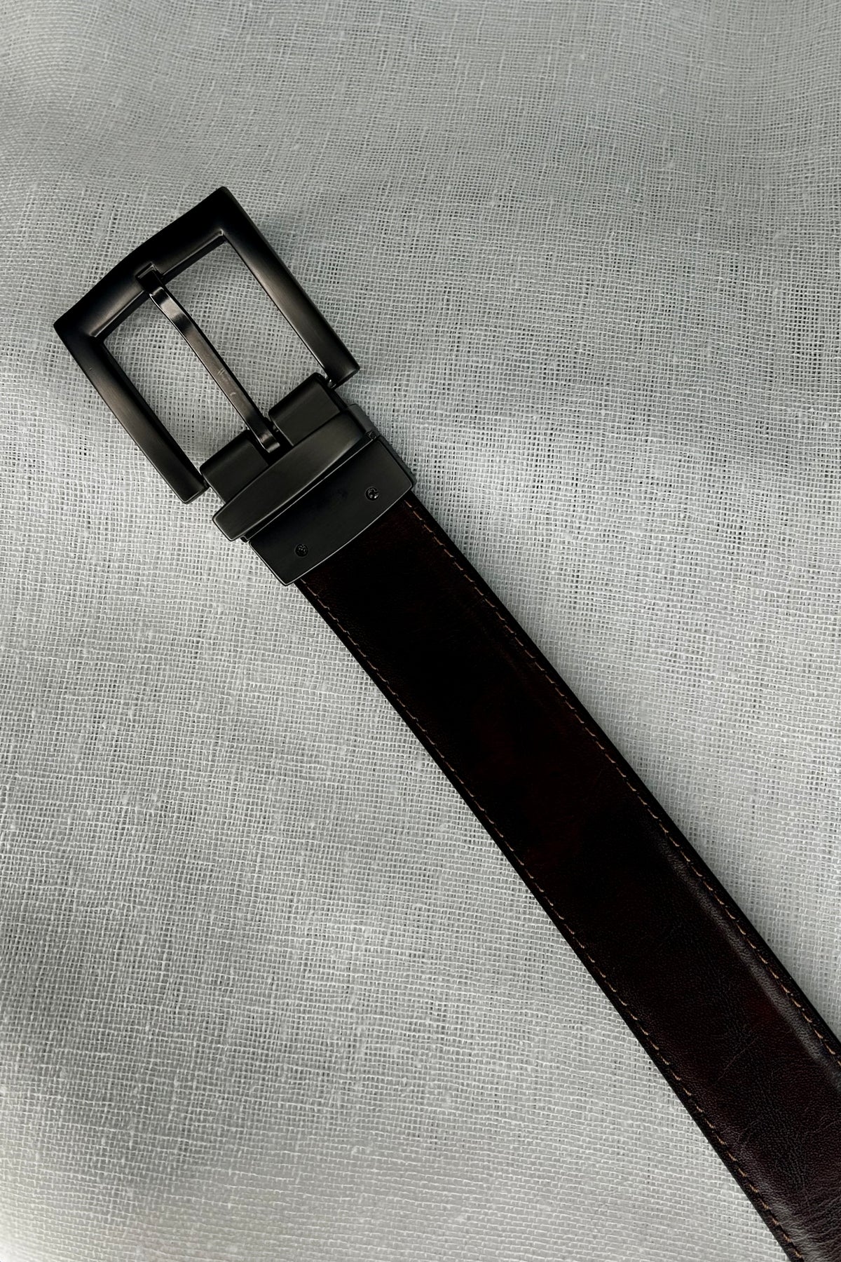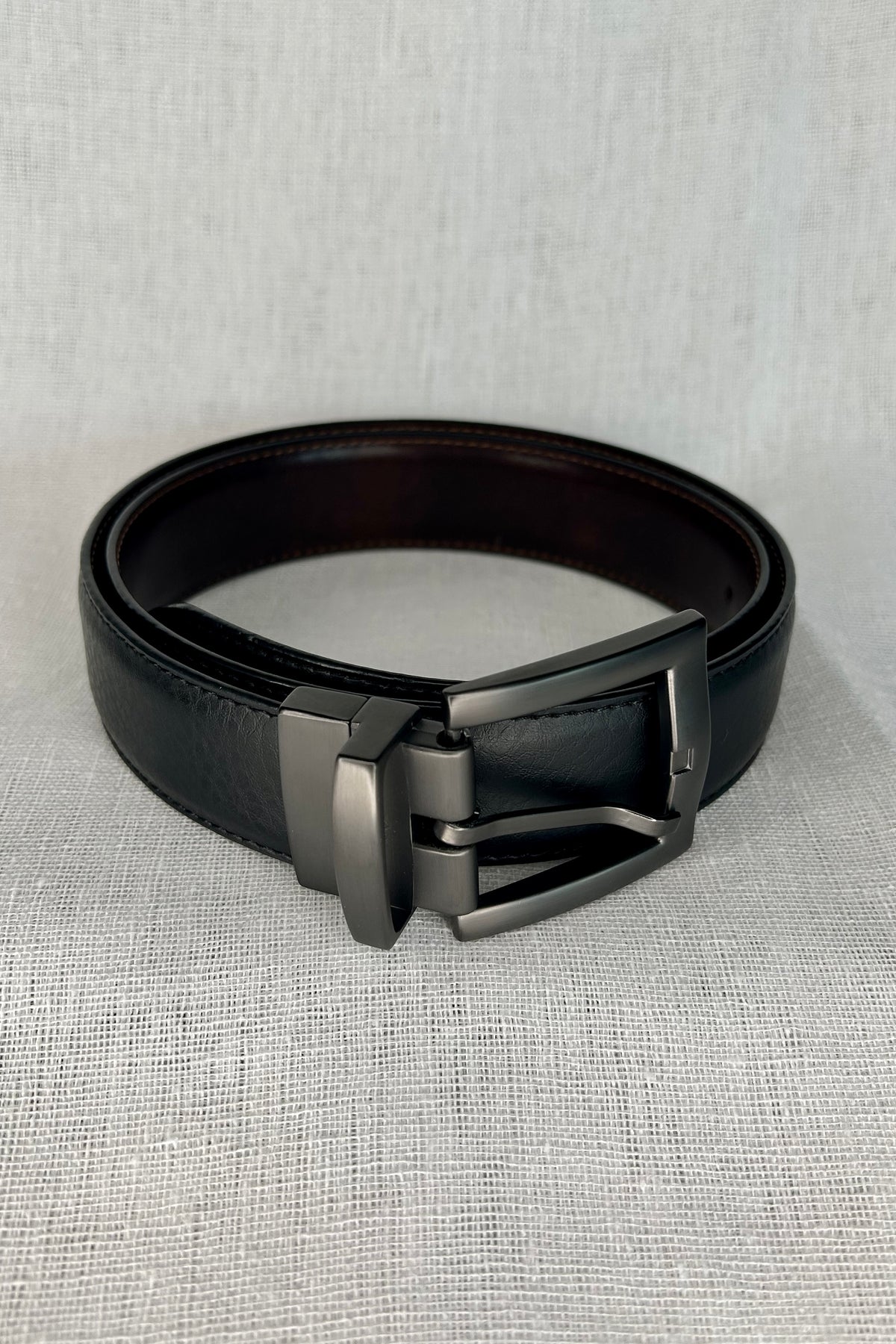 Reversible belt featuring tonal hardware for a sleek, modern look. Easily switch between black on one side and brown on the other to match any outfit, making it a versatile addition to your wardrobe.