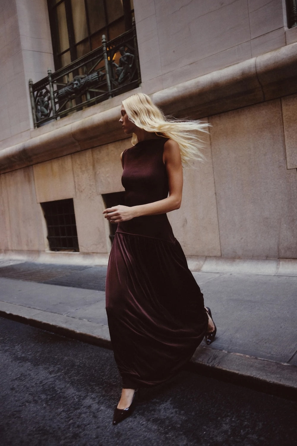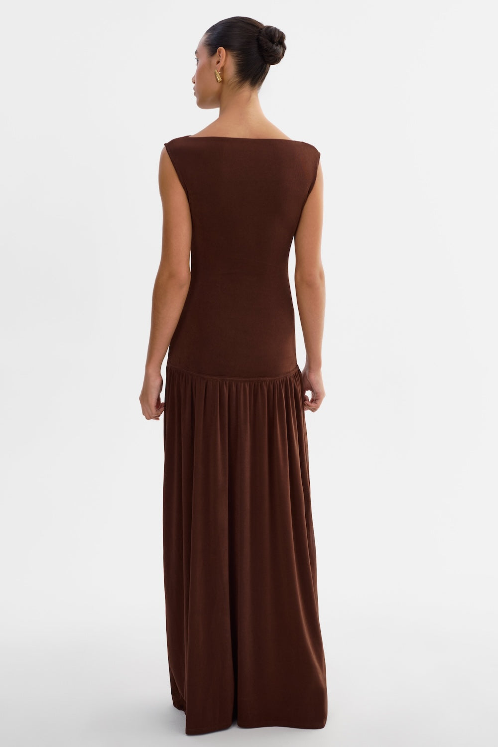 The Hanna Dress brings understated elegance with its fitted drop waist silhouette and fluid jersey drape. Designed with a sleeveless cut and boat neckline, it features delicate gathering at the hips for soft movement.
