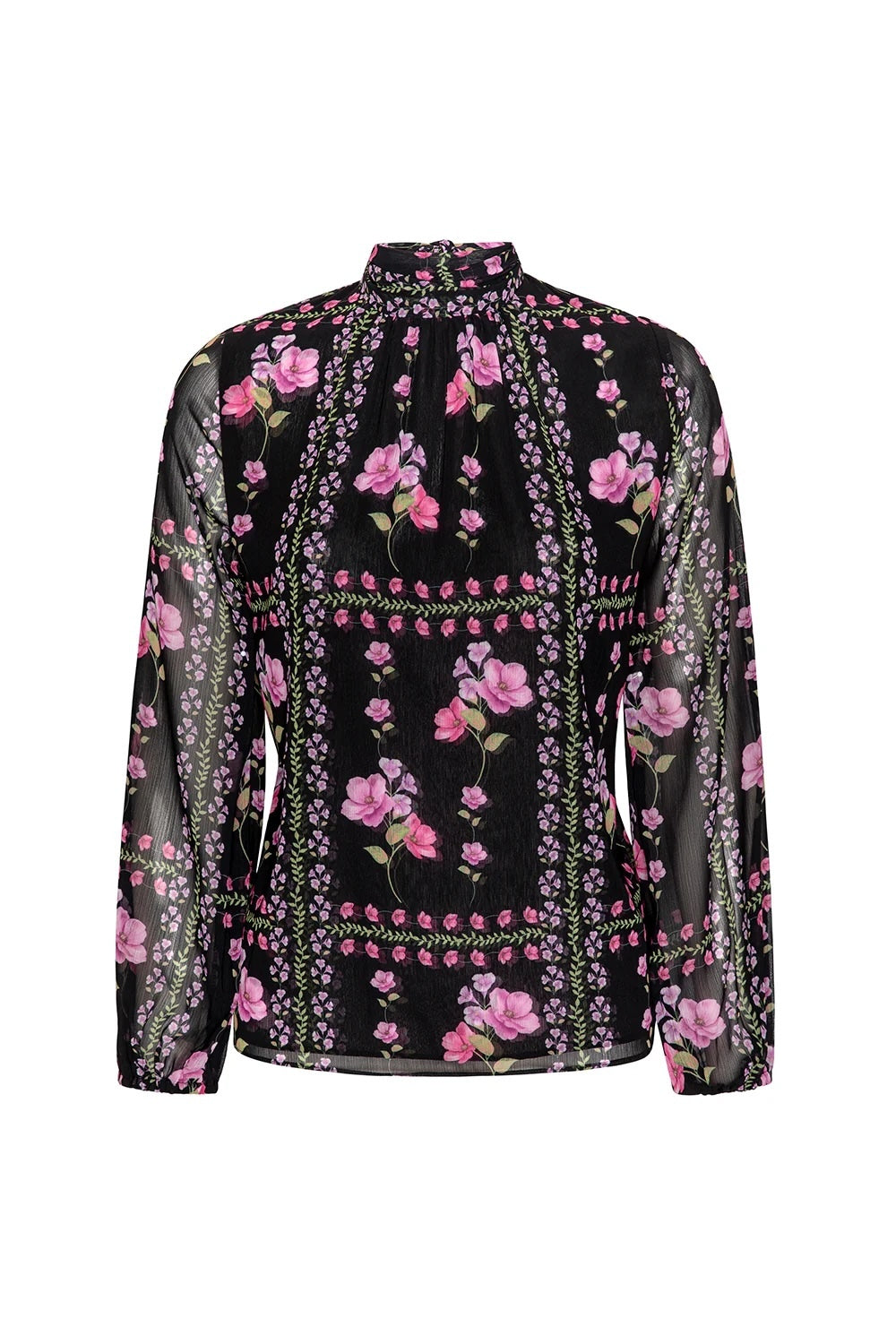 The Lulu top is a dreamy high-neck silhouette cut from chic Midnight Lattice printed chiffon. Featuring a tie-back keyhole closure and long sleeves with elastic cuffs, this elegant style has sheer sleeves and a double-lined bodice for perfect coverage.