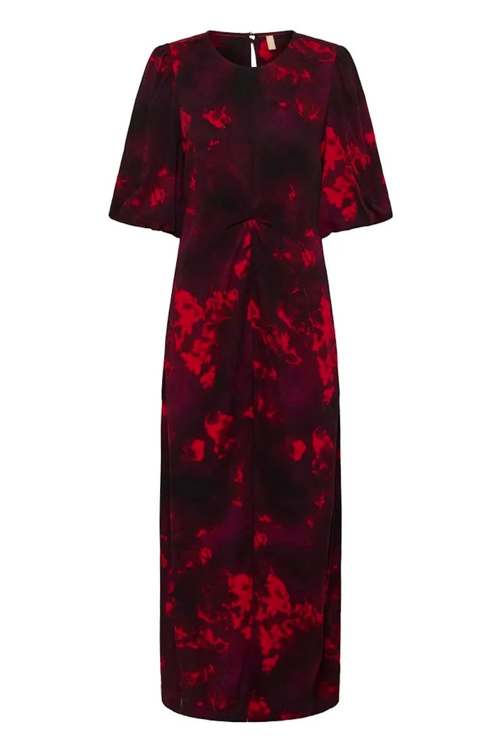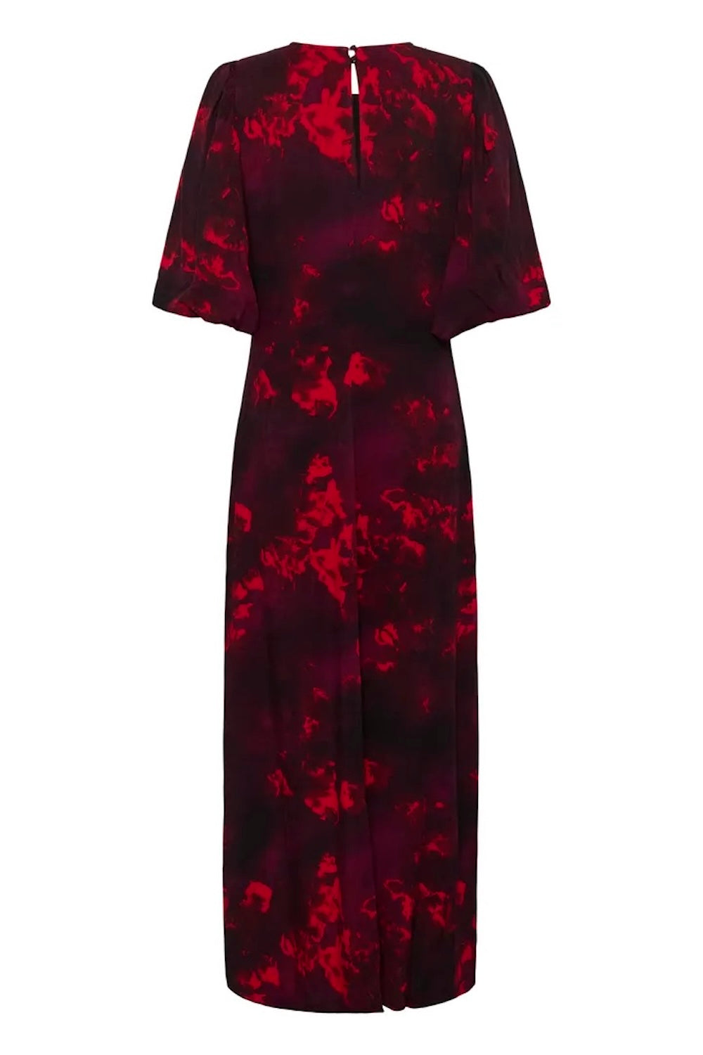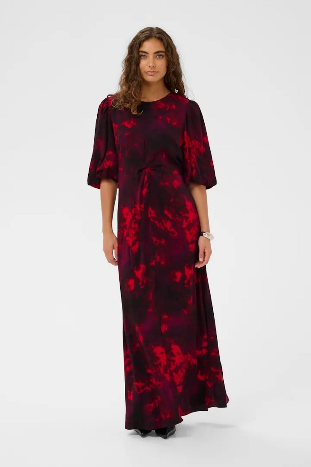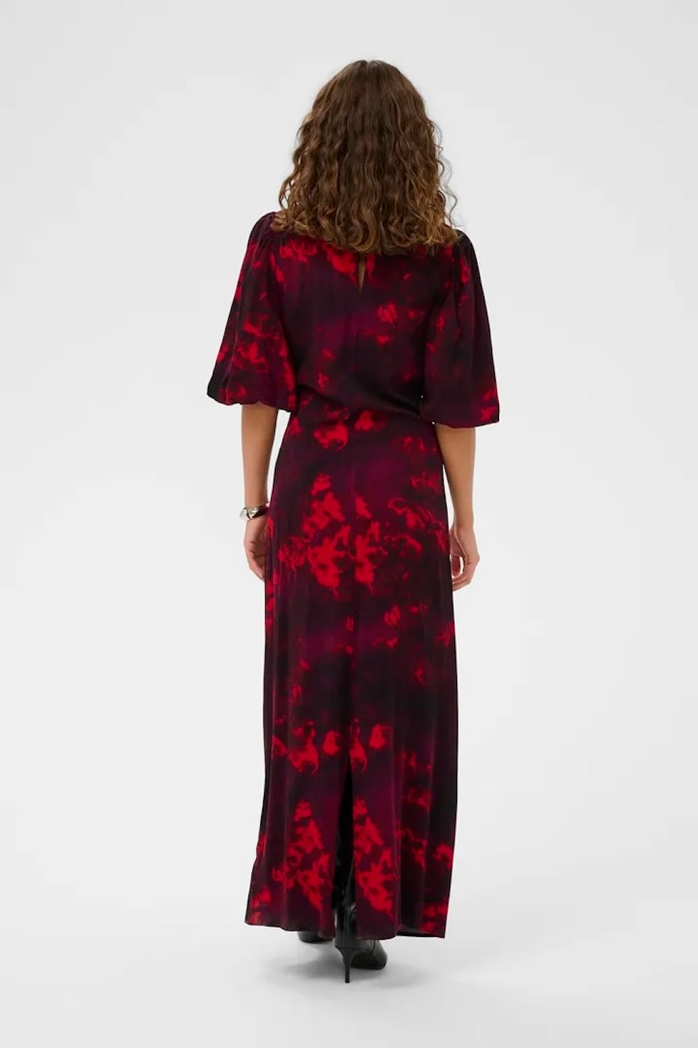 The Elsie Elitha Long Dress features a striking red floral print that adds a vibrant touch to your wardrobe. Designed with elegant quarter length sleeves, this dress offers both style and comfort for any occasion. Its flowing silhouette enhances your natural grace, making it a perfect choice for day or evening wear. Embrace timeless beauty with this effortlessly chic dress.